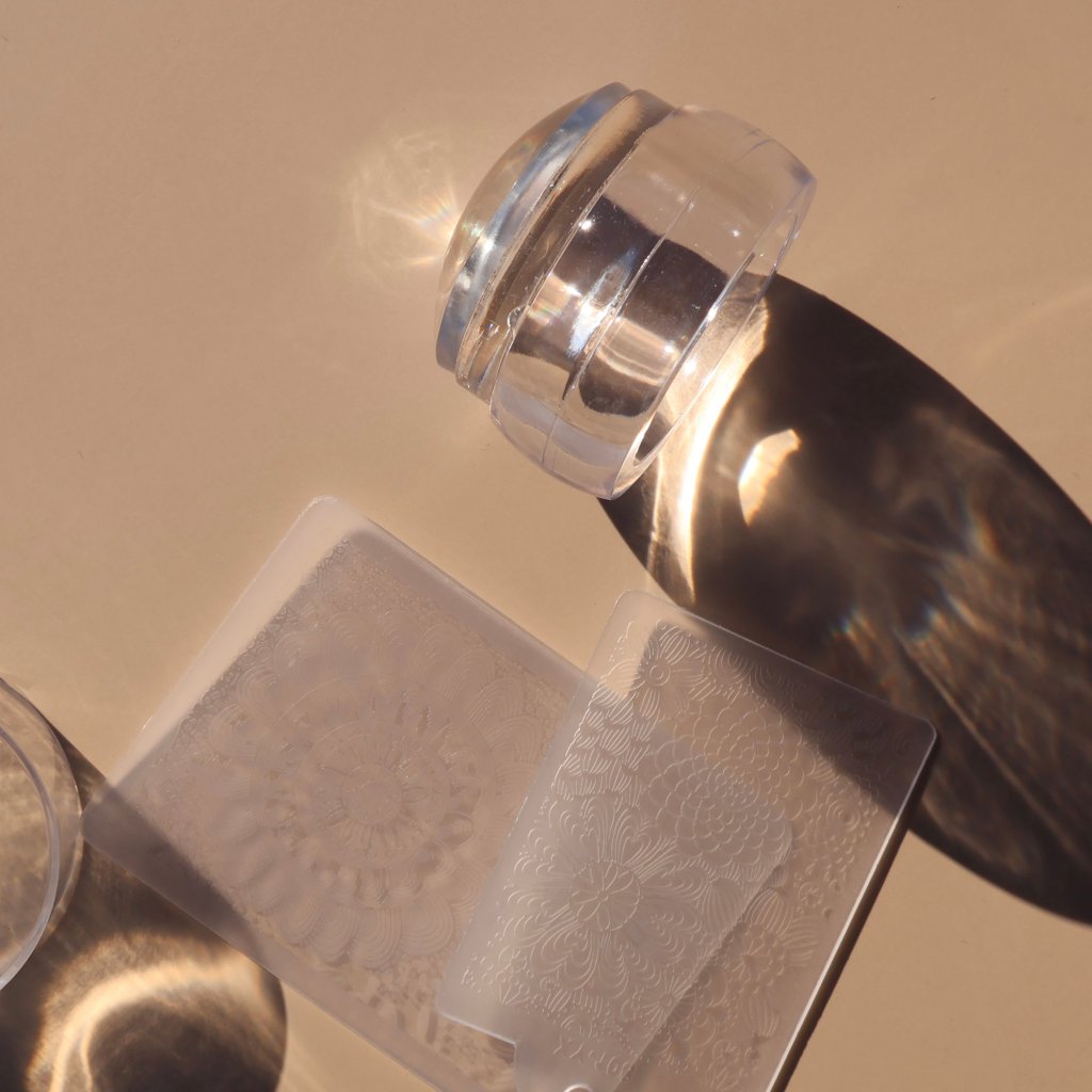 Stamping sada s priehľadnou silikónovou pečiatkou a dvomi platničkami plnými detailných vzorov. Pečiatka je vhodná aj na pritláčanie nail art nálepiek.